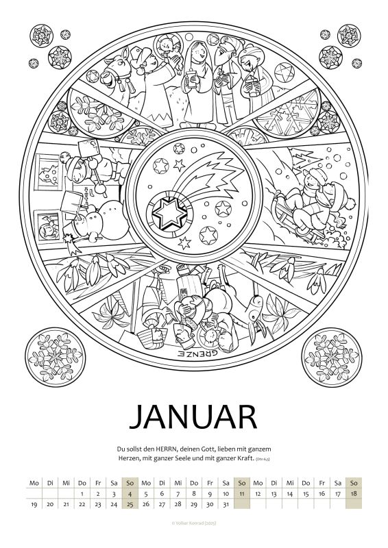 Here you find a new colouring project. Every month I’d like to bring up a new mandala fiting the months charakter and christian feasts. The pages a free downloadable for non commercial purposes.